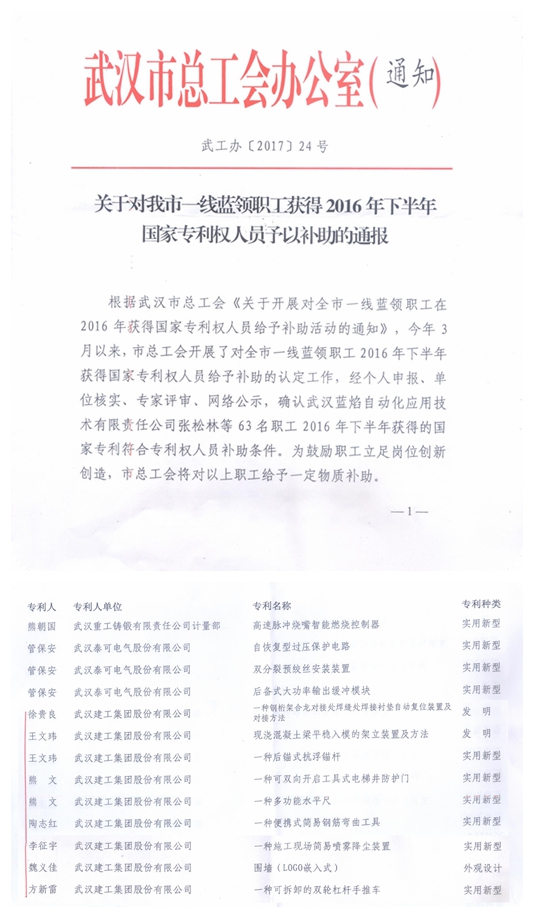 为鼓励职工立足岗位创新创造,近日武汉市总工会对2016年下半年获得国家专利权的一线职工发放了专利补助。经过个人申报、单位核实、专家评审、网络公示,全市共确认了63名具备补助条件的职工,其中武建集团的徐贵良、熊文、王文玮等7位员工取得的《一种钢桁架合拢对接处焊缝衬垫自动复位装置及对接方法》等9项专利成果入选。